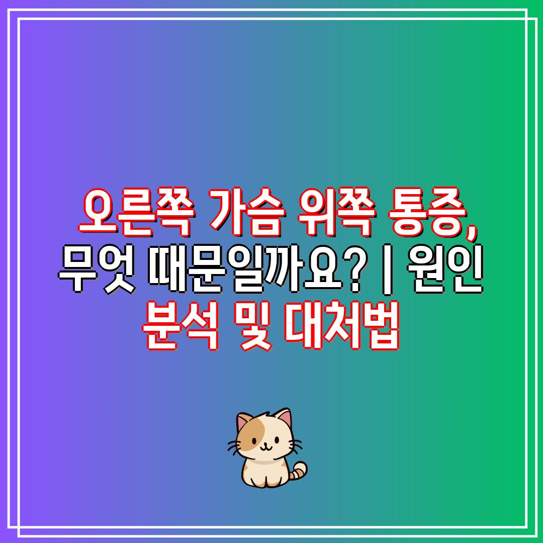 오른쪽 가슴 위쪽 통증, 무엇 때문일까요? | 원인 분석 및 대처법갑자기 찾아오는 오른쪽 가슴 위쪽 통증은 불안감을 유발할 수 있습니다. 가슴 통증은 심각한 질병의 신호일 수 있지만, 대부분은 심각하지 않은 원인에 의해 발생합니다. 오른쪽 가슴 위쪽 통증을 유발할 수 있는 원인은 다양하며, 근육통, 소화불량, 늑막염, 심혈관 질환 등이 있습니다. 본 글에서는 오른쪽 가슴 위쪽 통증의 원인을 분석하고, 각 원인에 대한 대처법을 알아보겠습니다. 또한, 가슴 통증이 나타났을 때 어떻게 대처해야 하는지 자세히 알려드리겠습니다.가슴 통증은 개인마다 원인과 증상이 다르므로, 자가 진단은 위험할 수 있습니다. 가슴 통증이 지속되거나 심해지면, 즉시 의료진에게 진료를 받는 것이 중요합니다.✅ 오른쪽 가슴 통증을 완..