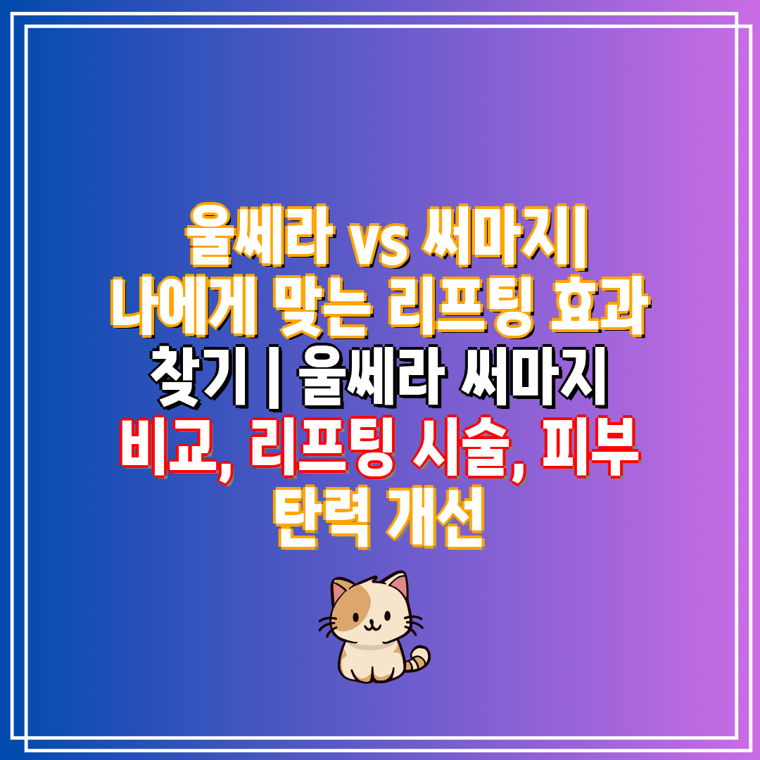 울쎄라 vs 써마지| 나에게 맞는 리프팅 효과 찾기 | 울쎄라 써마지 비교, 리프팅 시술, 피부 탄력 개선시간이 흘러 피부 탄력이 떨어지고, 처진 얼굴 때문에 고민하시는 분들 많으시죠? 울쎄라와 써마지는 대표적인 리프팅 시술로, 각기 다른 장점을 가지고 있어 선택이 어려울 수 있습니다. 이 글에서는 울쎄라와 써마지의 차이점을 비교 분석하고, 각 시술의 효과와 적합한 피부 타입을 알려드립니다. 또한, 시술 후 주의 사항과 기대 효과까지 상세하게 알려드리니, 나에게 맞는 리프팅 시술을 선택하는 데 도움이 되길 바랍니다. 울쎄라와 써마지, 어떤 시술이 나에게 맞는지 궁금하신가요? 지금 바로 아래 글을 읽고 나에게 딱 맞는 리프팅 효과를 찾아보세요! ✅ 울쎄라와 써마지, 나에게 딱 맞는 리프팅 효과는 무엇일..